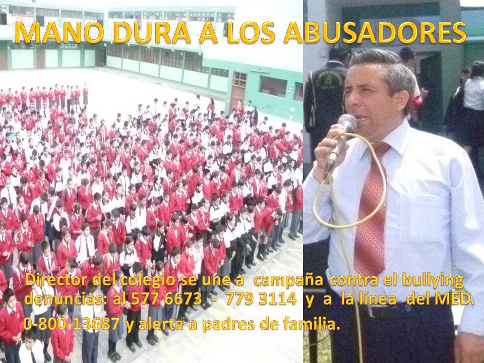 El director de nuestra escuela Pascual Aguilar Estrada iniciò la GRAN CAMPAÑA CONTRA EL BULLYING,. No solo en la escuela sino tambien en la practica de los medios de comunicacion, esta campaña tienen como fin contrarrestar los casos de bullying que se vienen registrando en la mayoria de las escuelas del Perù, para ello se han unido la comision de escuela de padres, CONEI Y la Radio Escolar.